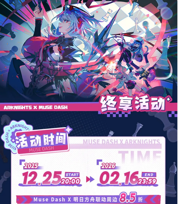 Muse Dash x 明日方舟联动的终享活动正式开启啦!活动时间:2025 年 12 月 25 日 20:00 - 2026 年 2 月 16 日 23:59联动周边将于 2026 年 2 月 17 日下架!另外,【12 月 19 日~ 1 月 6 日】Muse Plus 7.5 折!只要在 2026 年 1 月 26 日前购买 Muse Plus 即可无限畅玩联动内容;联动结束后,即使购