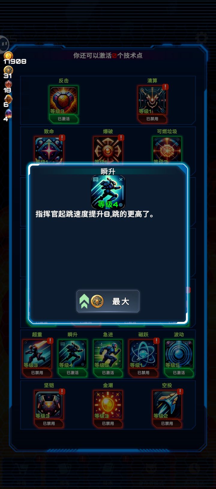 技术类似于技能投点,玩家等级提升获得点数,可选目标种类很多,投点有策略和倾向性,也有一定可研究的空间。