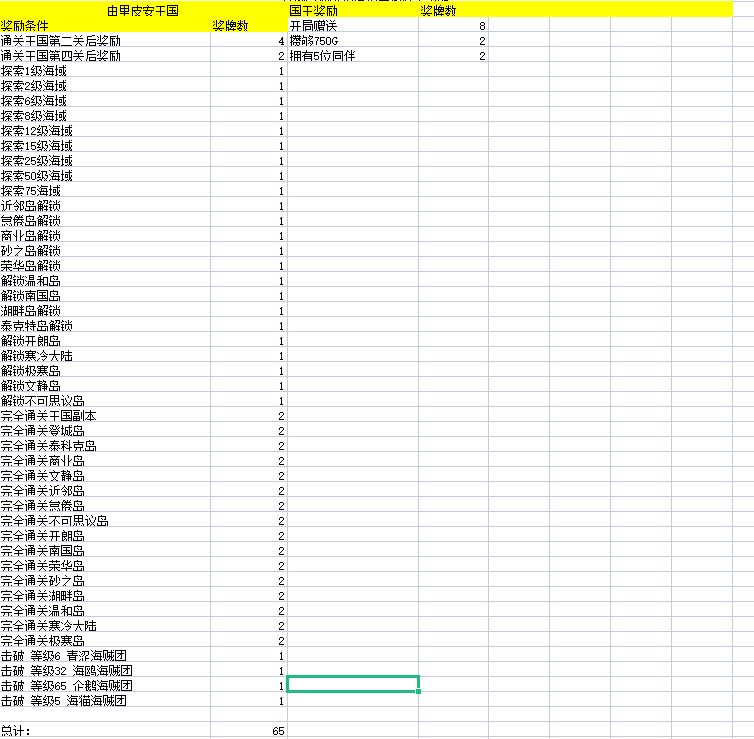一图9海域+4船+15岛=58牌 二图8海域给9牌(最后一个海域给2牌)+3船+10岛=42 三图6海+2船+4岛=26 四图5海15牌,四图要镇压岛才给奖牌,77级。。。 以上这些拿完差不多有141(四图海盗船没有算,主要是忘了有多少个)差不多是打完后就五十级了,然后开始国王给8个,出海给4个,然后奖牌用完后给2个(这个一般拿不到,毕竟你都在刷奖牌了)然后国王的奖励条件里有几个奖牌(没去算多少个