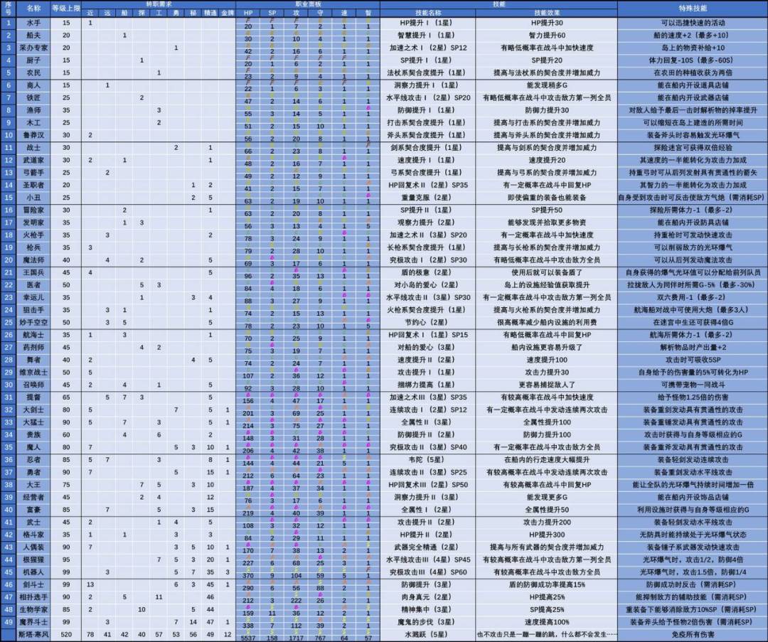 1.开荒船员配备:两渔夫6厨师1冒险家1航海家1木匠5船员4商人4发明家 说明:航海士木匠5厨师开局,其它船员全野外抓2星。最后一个厨师打据点副本最后一关时抓一下,如果不是两星再去酒馆招。厨师转木匠,船员转农民解析区的药剂师不好抓2星。只要不是商人去解析就行,2渔夫扫甲板,冒险时带一个。冒险刚需一个冒险家,能抓到两个最好,但别开2队,嗑加星药就行。两种店长都4名以内 2.船内布局技巧:a.扩建时会