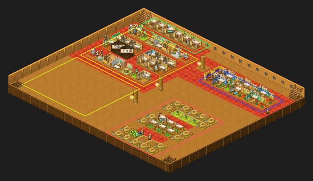 先发图,实用的困难布局。(从绮丽的白里面偷的) 绿色区域为渔夫区,转成王国兵后只要挨近楼梯快 点去打甲板就行。蓝色区域为商业区,任意6个工具 人转成任意种类商人都行,周边建筑优先顺序为:幸 运之鸟-绘画角-宝物资料馆-水槽,作用是周边商 店商品更贵,当然不放也可以。黄色区域为知识区,如果工具人多也可以放空出来的黄色区域,红色区域为农业区,植树厂和农田都可以,收货的数值要 400以上,周边放宠物屋可
