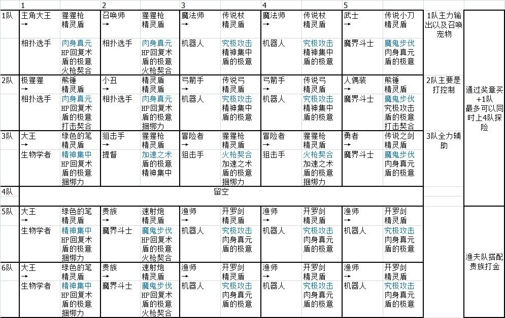 搜职业初始特技和精通总是东一块西一块麻烦死了,不如自己动手…… 还是excel渣图整理,附带个人出战队伍理解 先上最终图出战图 前期买3队位置,出战两队+宠物基本就够用了,别轻易买第四队,同时挨4排打受不住的 下面是全职业解析整理 附送全抓怪地点 注意厨师基本抓不到,前期酒馆买6个,早买早享受。 算下来,一套最终成型阵容需要以下人手,按最低配置 主力出战队伍: 15人=5×3(含两冒险者,这货貌似