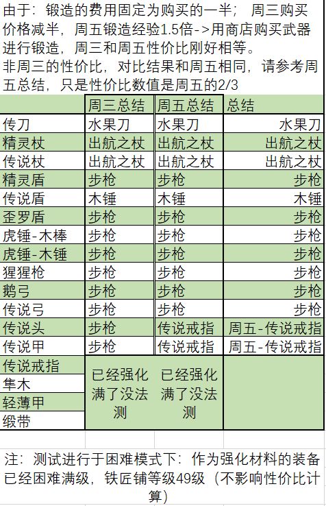 突然想起论坛里有人说过现在锻造不限制一次添加的格子后,锻造材料的格局会发生变化,于是<s>今天</s>这周摸鱼的时候测了测<s>周三</s>和周五的强化性价比。 测试是在困难模式下,作为材料的装备都已经困难满级(噩梦还没进过以后有机会再测吧),铁匠铺等级49级。经典三件套计算时把它们的卖出所得加在了成本上,但是影响不大总归是被完爆的。如果有哪里有问题请大家一起讨论。 捉个虫:刀类最便宜是水果刀不是