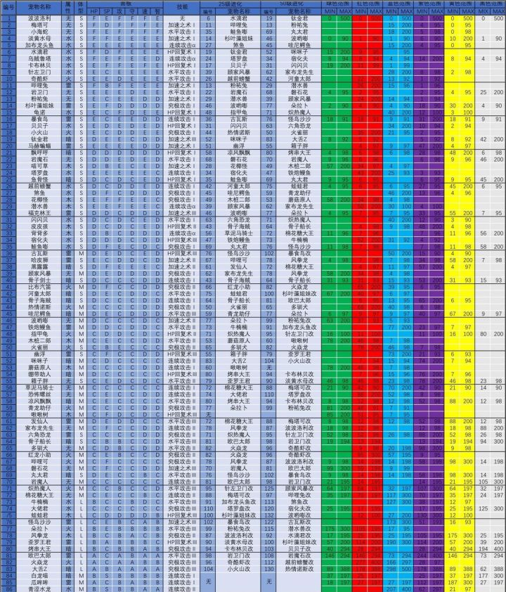 为了方便觉醒查材料,整合了以前的资料出了个新进化表,进化和退化都有可以一张图直接查完了。没有色素那些,主要是觉醒时查着方便,不管孵蛋。进化表简单说明:1、表格左边列是宠物的编号方便查找。2、表格右边列是进化树,包括退化前两级和进化后两级,编号宠是周围有金色光芒的那个图标。部分宠是没有进化型和退化型的。以此图为例:1:拿到0级的71号炽热魔人,25级会进化成针左卫门改,50级会进化成顾家风