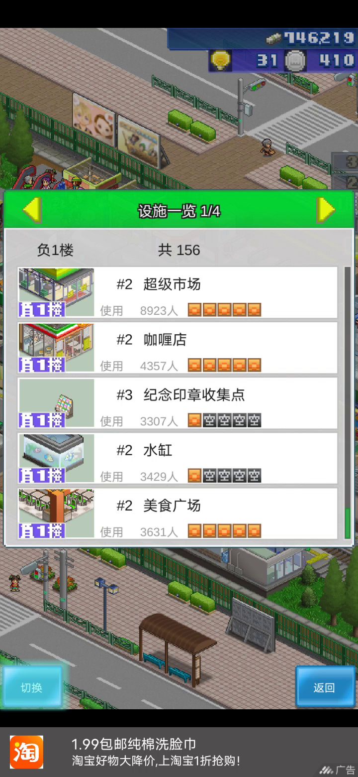 目前设施的招租星级需要一层层楼一个个点过去看才知道,有时候做一下调整又忘记哪个需要重新招租了,建议设施一览里切换可以加上设施的招租星级