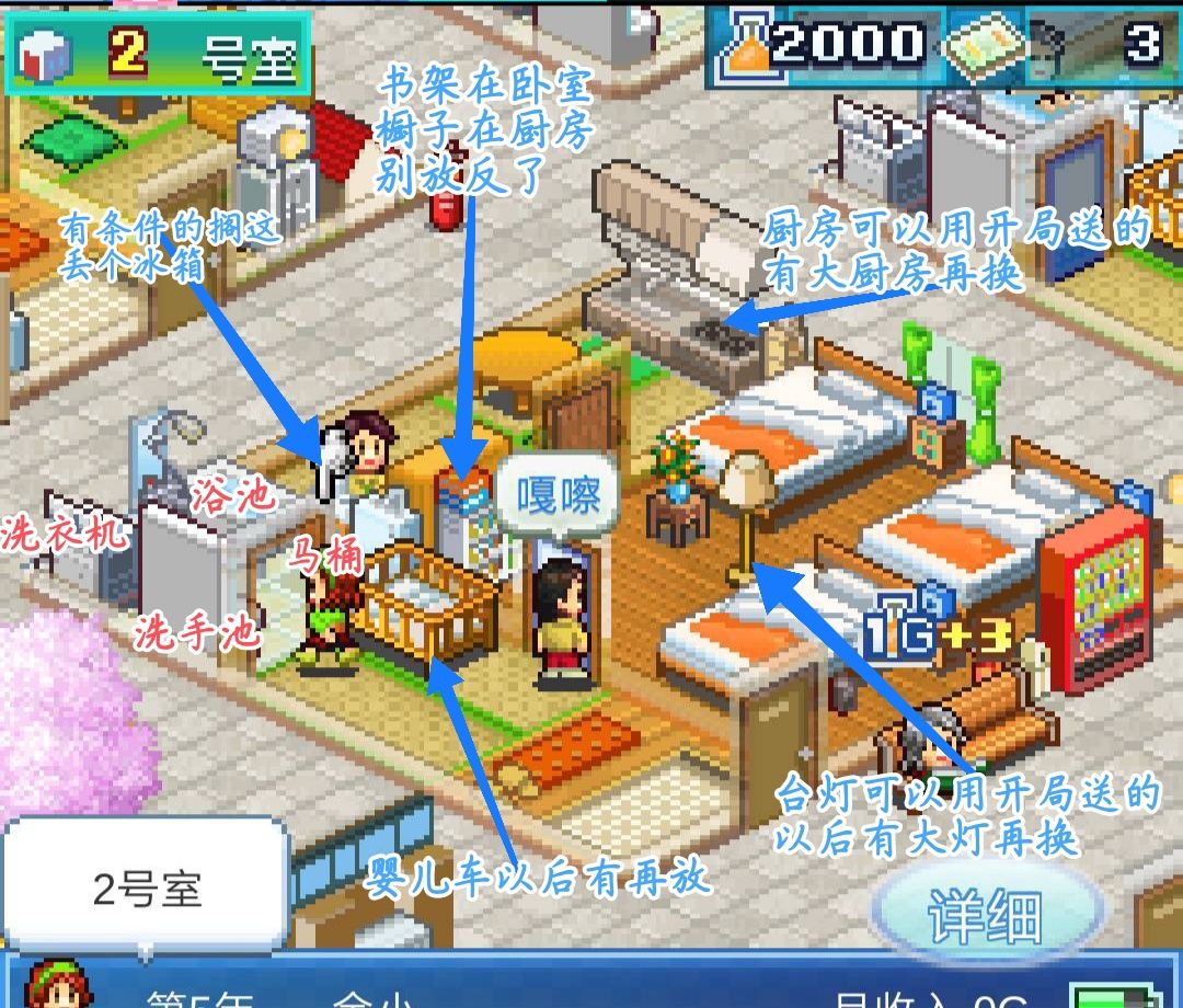 挂钟,日历组成时光房,木地板加床组成婴儿房,厨房还有浴室都各成一个专用房间,如果觉得不够可把玄关门口附近的三个其中一个换成花瓶放到窗户所在房间可在组一个专用。 此外要注意居民的工资,不用一下次全放上去,根据居民的工资变化适当增减(可使用道具变更工作以及咨询里让居民挑战增加工资)
