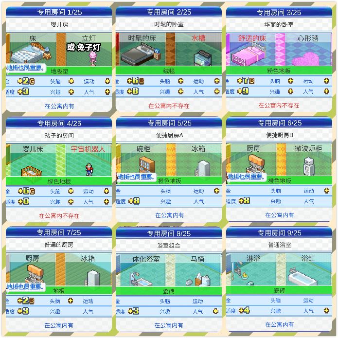 以地图2精致街道的布局+游戏截图,和地图3广阔大道的布局为例。先说一下,我玩开罗游戏,都喜欢把所有辞典相性收集齐,所以布局中69个专门房间全有,包括有减属性的布局我也放着的。以地图2精致街道的布局+游戏截图,和地图3广阔大道的布局为例。顺便想问一下,开罗君、猩猩像、水槽具体怎么出?虽然打出来了,但有点随机,不知道具体什么条件。先说一些tips:1. 把公寓分成3*3的九宫格,也是每次