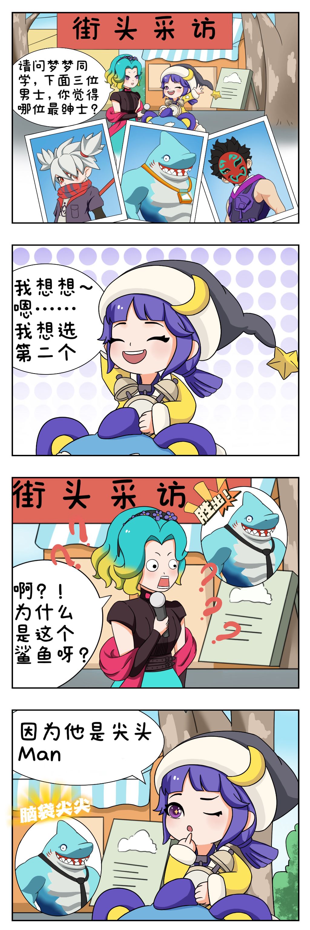 在梦梦熊的神仙脑洞加持下 外形粗犷的鲨克鲨克🦈 在克洛瓦城的绅士评选中脱颖而出✨ 伶小姐在听完梦梦熊的解释后 表示大受震撼(°△°) #掷在四方 #掷在四方测试 #四格漫画