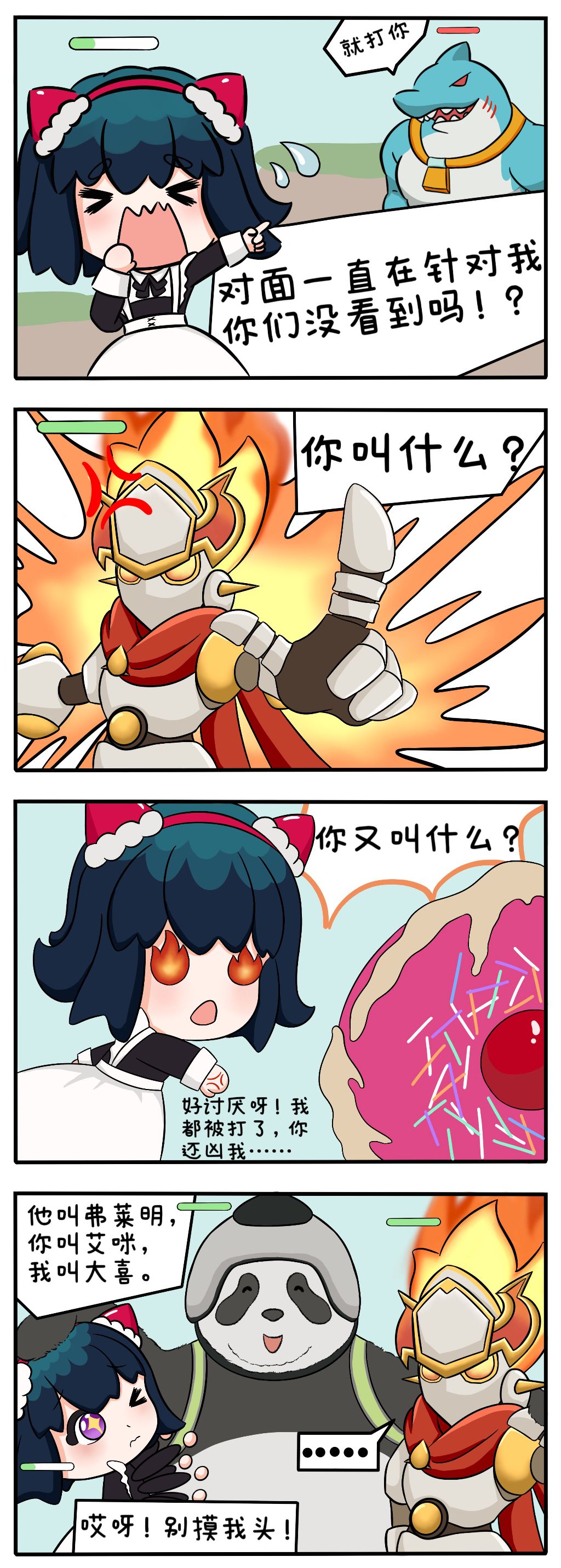 在乱斗场陷入不利局面时 队友间难免会有点小摩擦 好在咱们有“团队润滑剂”——大喜!🐼 悄悄问一句:你们熊猫的情商都这么高吗?🤨 #掷在四方 #掷在四方测试 #游戏推荐 #四格漫画