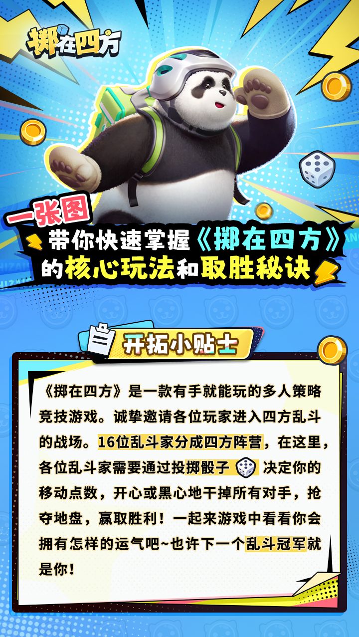 四方乱斗,一触即发⚔️ 掷在四方PC&安卓双端测试 即将在1月16日正式开启 刚踏入全新的策略竞技世界 不知道从何入手? 萌新宝宝们别担心! 星雅带着新鲜出炉的教学视频 来帮大家快速了解乱斗场👇👇👇 看完视频的宝子别急着走 再来跟星雅一起 把本期攻略的知识重点 巩固复习一遍吧! - 01 玩法介绍 - 玩家在进入对局前,需要选择一名乱斗家角色,并配置相应的伙伴阵容和通用技能。另外3名队友一起,与其