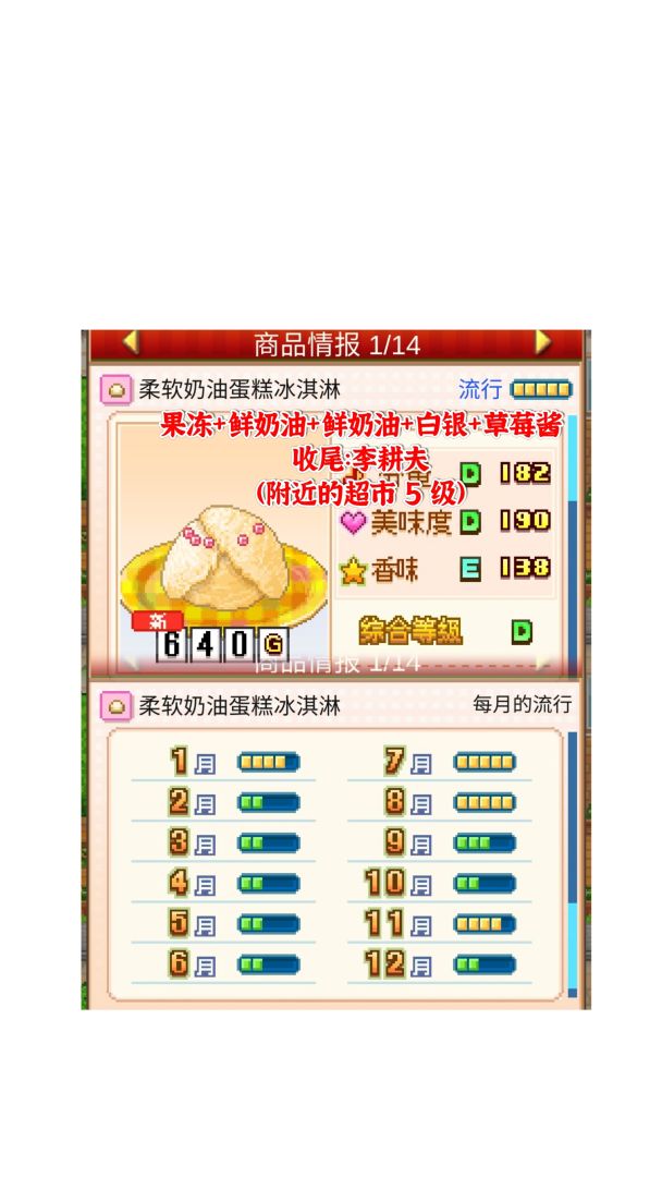 彩色盘子/和风盘子+果冻+打泡奶+樱桃+浓缩咖啡+杏仁 这个是我看了很多攻略找到的一个,很多大佬的新手攻略做出来都因为食材等级不够达不到数值弄不成无微妙,这个我做出来就是无微妙,这个配方做两遍,把货架搬到里出餐口旁边会更快一点,前期可以只买这一种蛋糕,这一个配方做两边就会变成两种蛋糕