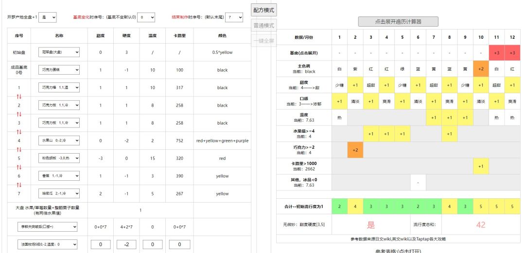 猜想:与卡路里无关(待验证) 配方:4产地10级,黑色星空盘(无酱)+戚风卷(1级)+打泡鲜奶(168级)+抹茶巧克力(105)+砂糖开罗(64)+椰果(111)+打泡鲜奶+抹茶粉(7)+砂糖开罗,高级别材料提升(朱葡萄,技能超进化) 控5甜度5口感,完全不控卡路里,人气低迷,但是喵司虎终于来了。 只有抹茶粉是为了5-5控条,其他基本都是终极巧克力前中盘子的普遍材料,适合刷级挂一晚上。