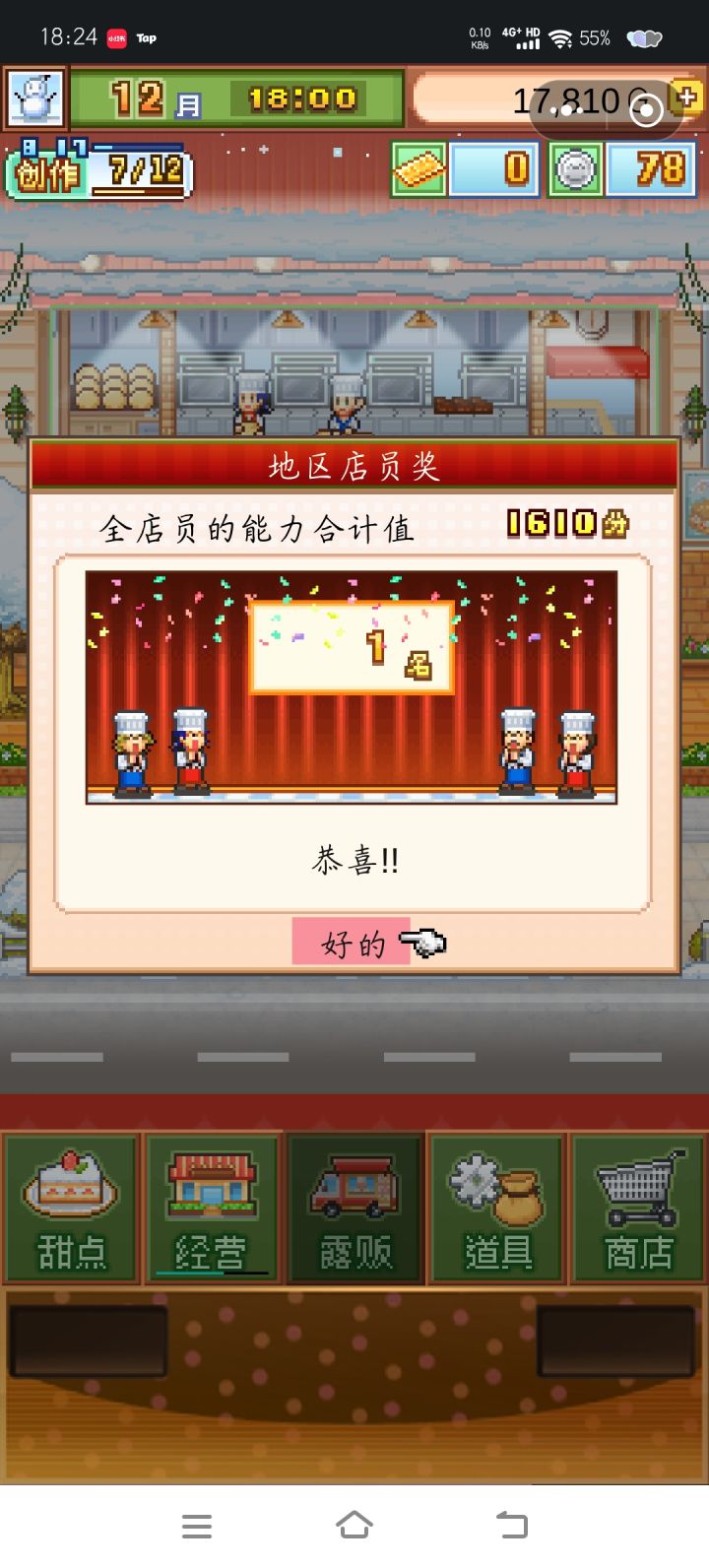 自我感觉良好,平时上线做做蛋糕,参加比赛。及时更换货架的蛋糕,提升员工等级。希望可以做得更好!