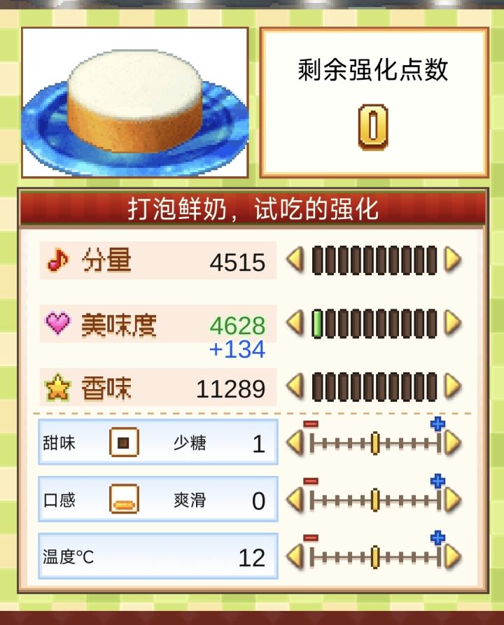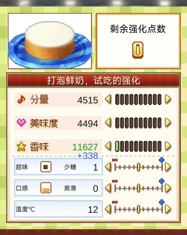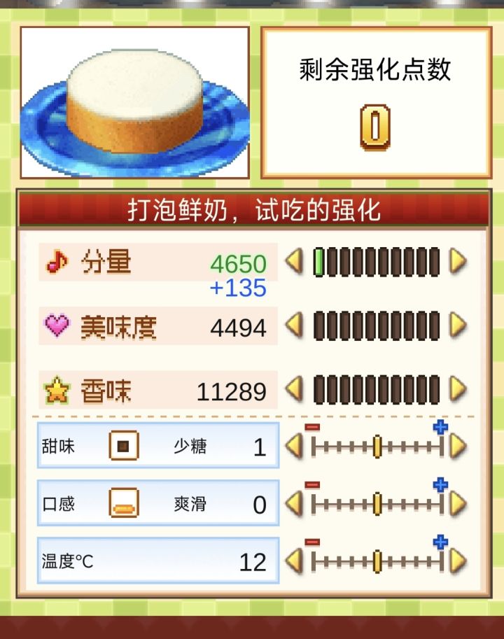 消耗1点强化点数,可以让温度/口感/甜度三者中的一项减少/增加1点,或者让甜品的三围(分量,美味度,香味)中的一项提升2.9%.#创意蛋糕店