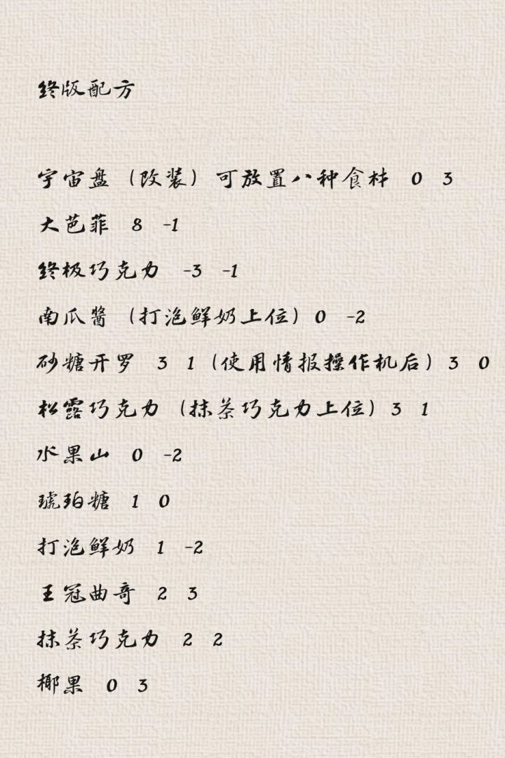 配方如图之前的错误已修改再补充一个566人气的芭菲配方(给田先生的3900用):冠军盘----香草冰淇淋+很多草莓+椰果+椰果+打泡鲜奶+打泡鲜奶+抹茶巧克力----第四产地苦味技能+兰栗田收尾----属性(甜度5、口感4,人气为500+66,有轻微浮动)#游戏种草计划#游戏安利#攻略#单机游戏#新手攻略#休闲游戏