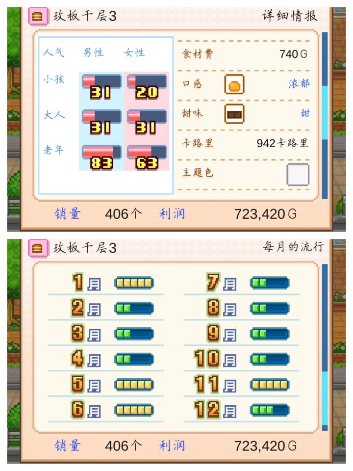 精华系有点特殊,加入顺序不能乱。担心变不成馅饼,可以直接把精华系滴在鲜奶冻上,如黑胡椒酱。鲜奶冻+黑胡椒酱+打泡鲜奶+打泡鲜奶,可以变馅饼。鲜奶冻+打泡鲜奶+黑胡椒酱+打泡鲜奶,也可以变馅饼。鲜奶冻+打泡鲜奶+打泡鲜奶+黑胡椒酱不可以变,但是原料已经放完了,后面不管加什么装饰都会变馅饼。馅饼天生1,2月流行。本身的黄色在7,9月流行。蛋糕大盘和椰果是白色,在1和11月流行,把椰果包起来,不显色。如鲜奶冻+装饰奶油+黑胡椒酱+椰果+打泡鲜奶,1279四个月流行。另外鲜奶冻+椰果+打泡鲜奶+黑胡椒酱+打泡鲜奶也可以变,应该就是加入顺序的问题。不知道你玩的是哪个版本,taptap的开始游戏右上角有存档。上传再读取,方便研究配方。