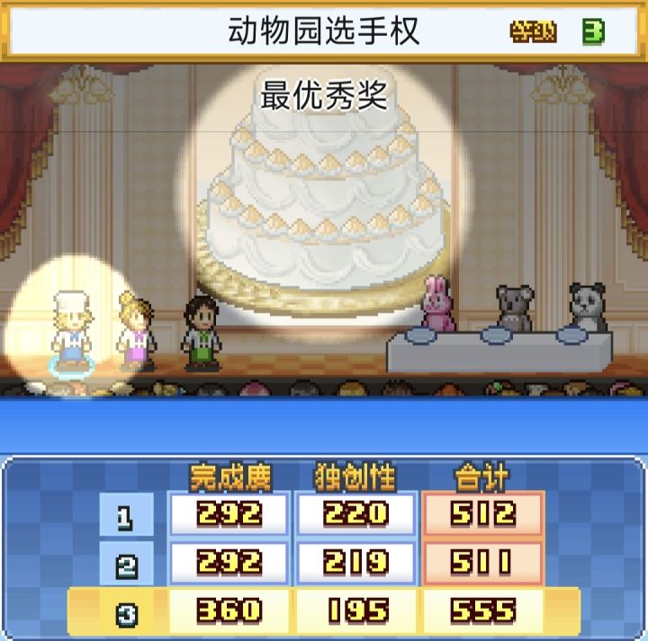 #创意蛋糕店配方 配方:瑞士卷+豆馅lv251+巧克力加工极lv68+豆馅+巧克力加工极+王冠曲奇lv124+豆馅+水果山lv43+砂糖开罗lv72(豆馅用道具将卡路里压到520)太阳牧场lv10 兰栗田(突破后)收尾终于过了比赛开心