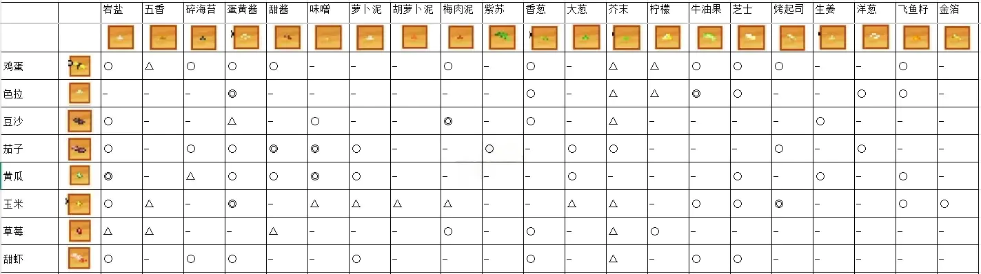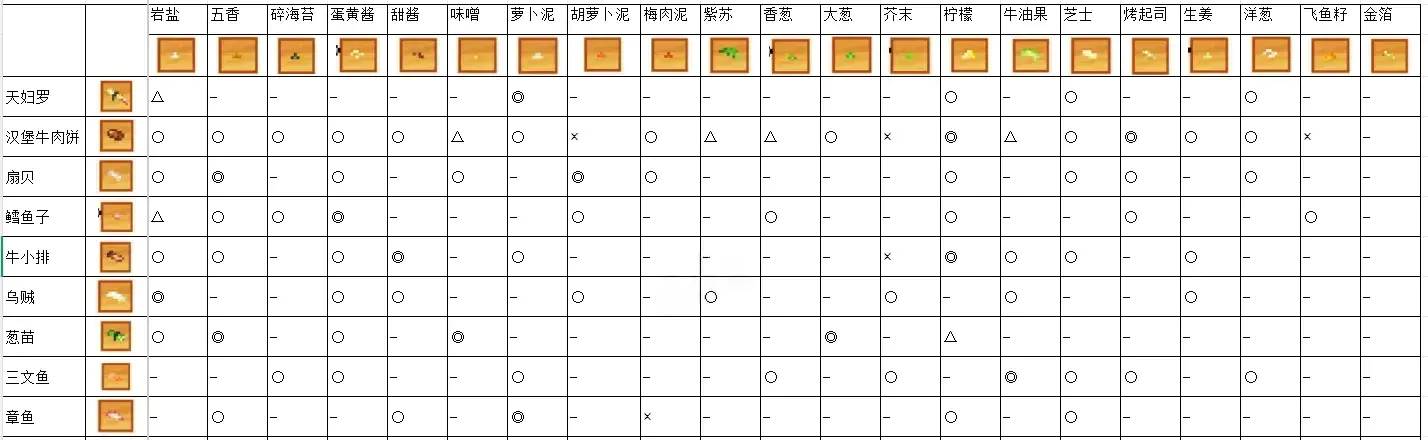 攻略大家看白凝语大大的就好,我不过是个一周目没过日本第一竞赛的小废物罢了。想补充的一点就是只有自己创造出来的寿司可以改名和删除,点开料理后随便点一个自创寿司的左下方就有一个指令的按钮,就可以进行改名和删除接下来是食材相性表(其实百度也能查到)