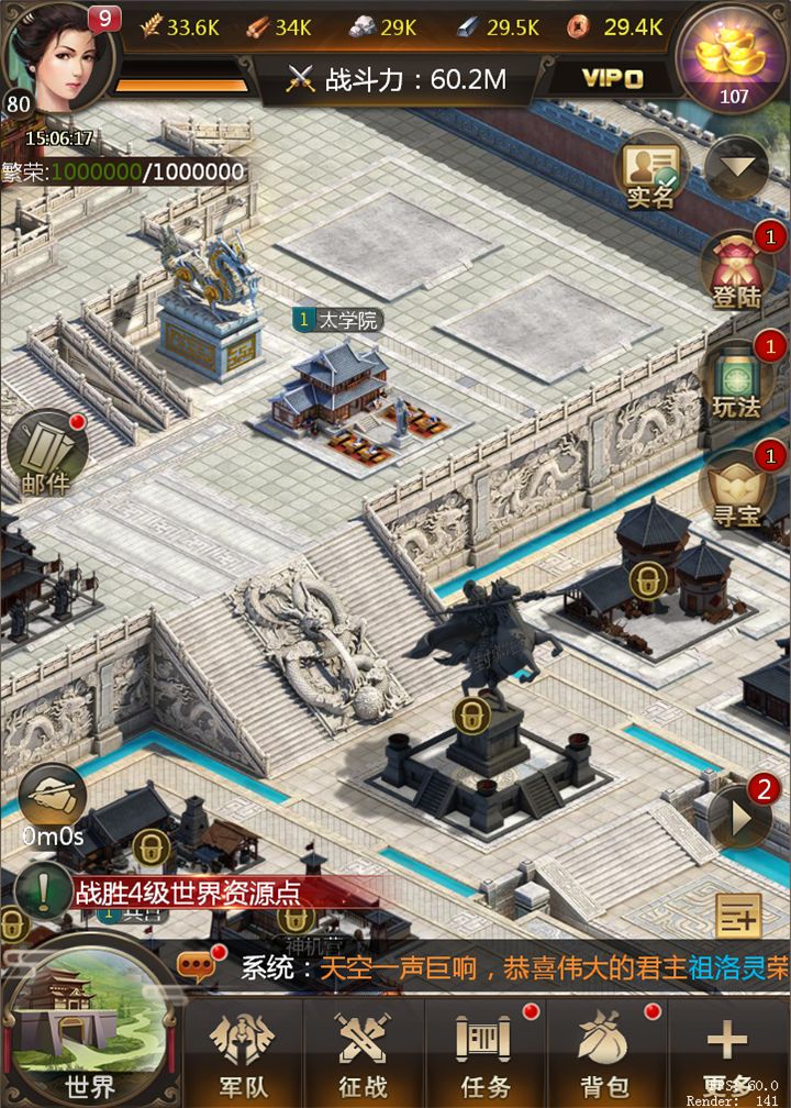 1、如果你是第一次玩,我相信你开头是有点迷的,不知道该进行些什么操作比较好!我们直奔主题,点击游戏界面中左下角有面旗子叫“政务”的,前期升级全靠它了,并且跟着任务(也就是政务)走,你也可以大概了解这个游戏了。2、暴兵!屯兵!不论攻城掠地还是防守城池刷副本做活动等等,都需要用到兵,所以赶紧升级兵营募兵,兵种后面可以升级的不用怕招募多了放着浪费。3、屯资源!升级皇宫后可以获得空白资源地,一解锁新的
