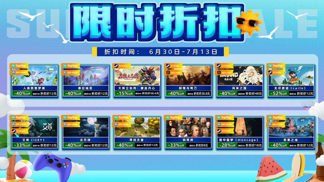 各位XD独立游戏的玩家们: 大家好૮(˶ᵔ ᵕ ᵔ˶)ა~7月将近,各个平台的夏促活动也即将从6月30日起陆续开启!XD独立游戏发行的部分游戏也将在整个7月间陆续参与到夏促限时折扣活动当中! 🔔 夏促开启:6月30日-7月13日 在6月30日-7月13日期间:《人类跌落梦境》、《泰拉瑞亚》、《笼中窥梦》、《寻找天堂》、《去月球》、《艾希》、《钢琴师》、《恶果之地》、《双子》等共计14款独立游戏的手