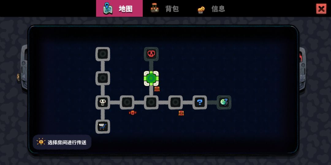 地图篇主要是讲解地图所包含的内容 以这一个地图为栗子🌰,地图绿色代表自己所在的地图。地图右下角有糖果,说明有补血没有捡。地图右下角有宝箱说明地图有宝箱没有开。白色骷髅是小boss房。红色骷髅大boss房。没有任何标记的为普通房间。 普通房间掉落木箱子,小boss房掉落银箱子,大boss房掉落金箱子。 顺带提一句,打大boss没被打到的话,还会额外掉落一个被动,和神烦鼓掌小人。(机甲和护盾好像也能破