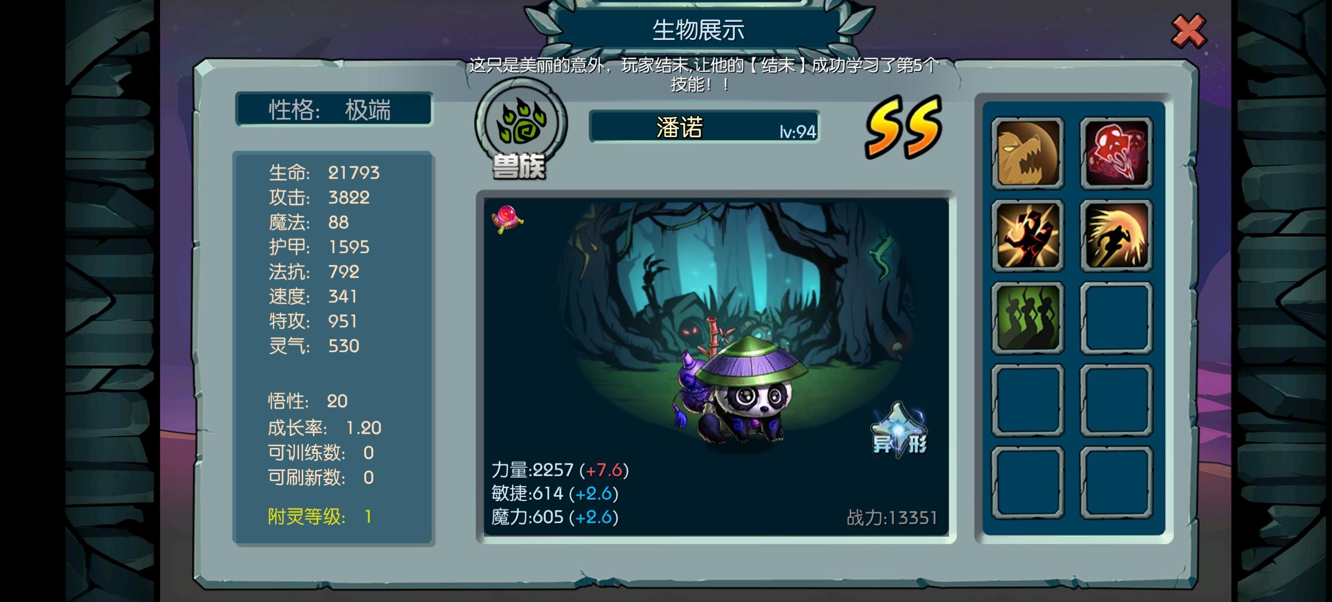 萌新前其该怎么玩呢,我推荐的阵容是1只迅猛怪玩(迅猛击)打前排,而且迅猛击吃敏捷加成,迅猛怪有个皮肤加40%敏捷,但是要先花300钻购买,还要觉醒,觉醒用10只相同的迅猛怪觉醒,也可以用百变怪觉醒,不管推图还是打架都还行,技能的话(怒吼,迅捷,追魂,暴发),我下面图那个是还没搞好的然后推荐1只迅猛怪玩(暗杀),主切后排,技能打上(追魂,迅捷,暴发,恕吼),这样的,打图和打竞技场都挺好用的,图我也