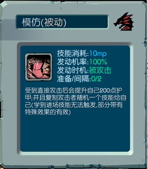 技能消耗:代表每次释放该技能所需要的魔法值发动概率:很好理解吧发动时机:很好理解准备/间隔:0/2 这个其实是2个属性前面的0代表这个技能进入战斗后需要间隔第几回合开始释放,这里是0,就代表进场就可以触发该技能;后面的2就是代表这个技能的间隔CD,当该技能触发后,需要休息几回合才能再次触发,这里显示的是2,就代表第一回合触发后需要到第三回合的时候就可以继续触发啦。