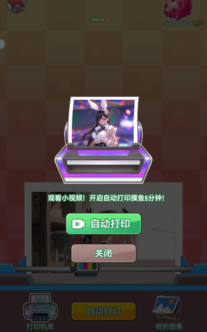 游戏别出心裁的内置了所谓的“AI打印机”,不断点击屏幕,便会慢慢生成出一张内定的AI图片,也有一个类似游戏广告里的“休闲小游戏”模式。