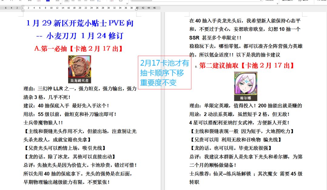 1.目前新区有最新的 新手新晋卡池。可以直接许愿 卢克 罗杰, 然后搭配新出的卡池,选1-2个强力就足够开荒到55级,不要乱抽卡 40以前 高性价比走帝国:许愿卢克 许愿宰相 30级礼包选皇帝 坦克用SR光头,缺个物理输出,暂时用送的雪梨; 优点:节约型帝国阵营,强度够; 大概花费40-140抽 成型; 宽裕的钻卷可以抽取其他卡。 当然还有其他阵营开局,可以见论坛其他帖子,。或者评论区的大佬们意