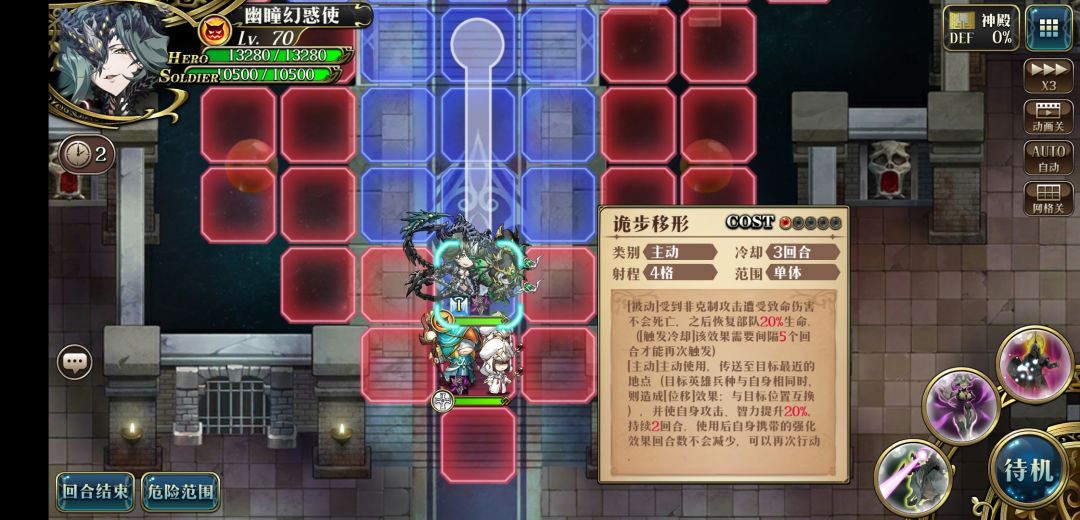 幽瞳幻惑使新角色前瞻关卡双成就: 1.出击往下走到头,用1c和下面骷髅兵换位 2.对下面的枪兵和骑兵用幻惑 3.用3c打死打死骑兵 4.僧兵打用技能死骷髅兵 5.幻惑使往上走到头有2c打下面俩兵 6.幻惑使往下走到头普攻枪兵 7.僧兵往下走普攻打死步兵 8.幻惑使用1c和枪兵换位,自己和僧兵幻惑,用3c打到枪兵一条命,回合结束后胜利