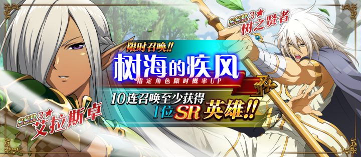 林间的疾风重燃战之意志,限时卡池开启;新的希冀划破黑夜,雪莉解锁SP形态!指挥官们,准备好接受挑战了吗?限时召唤-树海的疾风树界蔓延,遮天蔽日,疾风骤起之处亦是传说开始之地……呼唤之下,高贵的意志重燃,新时代的篇章由此翻开!活动时间 4月15日10:00-4月28日23:59限时召唤「树海的疾风」中SSR级英雄树之贤者、艾拉斯卓出现概率提升!同时,抽到的活动UP英雄已经满星级时,可同时获