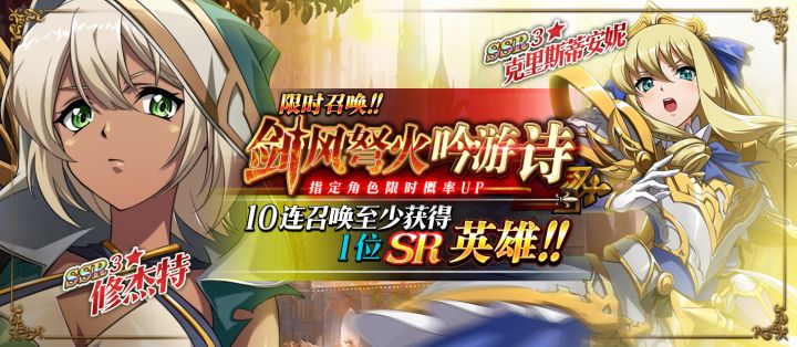 全新资料片“剑风弩火吟游诗”来袭!“重炮猎手”修杰特、“花语盾卫”克里斯蒂安妮华丽登场!全新玩法“神契”解锁,养成神契助你热血战斗……一段全新的冒险即将到来,指挥官们,准备好接受挑战了吗?新限时召唤-剑风弩火吟游诗诗人轻吟着过往,冒险之心从未彷徨……弩矢鸣动火光,利剑席卷锋芒,坚守正义的英雄,静候时空尽头的回响!限时召唤「剑风弩火吟游诗」中SSR级英雄修杰特、克里斯蒂安妮出现概率提升!活动