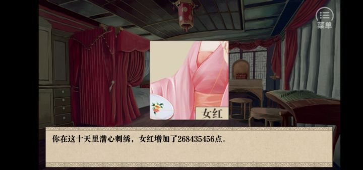 可以啊,卡bug,就是每月的第一次,三次选择休息,休息,女红。在休息结束后跳出女红(没有显示女红+1)一瞬间进行存档,然后就继续,如果是女红+1就读取你刚才的存档,一直刷到上面这张图,事半功倍,存档。然后打开存档读档存档这样反复,大概几十次吧,你的女红值就能刷的很高了,这个是倍数的2的n次方。不过建议最多刷到一个亿就可以了,你的女红值代表你绣完嫁衣(刺绣一定选高级精研~敷衍,这样可以省时间)卖出获得的金钱。刷高了卖个一两次嫁衣就有花不完的钱。其他的同理。而且后期你在巧手坊还可以绣出外装。适合收集癖的