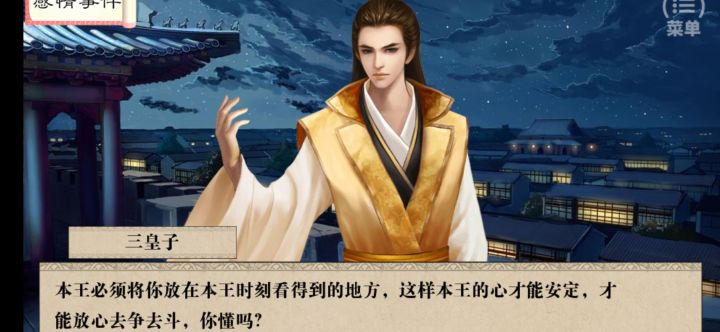 玩了好几天了,看了无数个攻略,终于达成了我游戏的第一个结局独宠之后,稍微分享一下吧!嫁给三皇子需要满足几个条件1.容貌女红必须要达到佳人贴的条件2.三皇子的好感度必须要刷满3.三皇子的好感度我也不记得是第几个月了,那个好感度要达到90左右,具体过程可以找胡妈妈聊天4.最开始一个月要找母亲解锁府门和另一个东西还有要去找自己的生母姨娘(具体这么说,是因为我不记得那姨娘的名字了🌚)获得谁家的儿