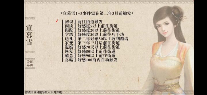 逛了一圈没看到妾室相关的支线,自己做个记录补一下。选的陶湛线(为触发李云儿后续),四个妾室,都收齐了,发现她们身上也有不少支线剧情,都是有故事的啊啧啧啧。程思思:这位支线要是嫁给别人才发现温罗是她恩人的剧情,不少人应该已经看过了。收了之后的剧情,生完长女,逛逛后院就会触发。颜欢:主要是刚收进来后那一晚的酒酿元宵剧情(没截图)。艳无双:好感0、-10、-20会触发剧情,-20就会强制收,不收