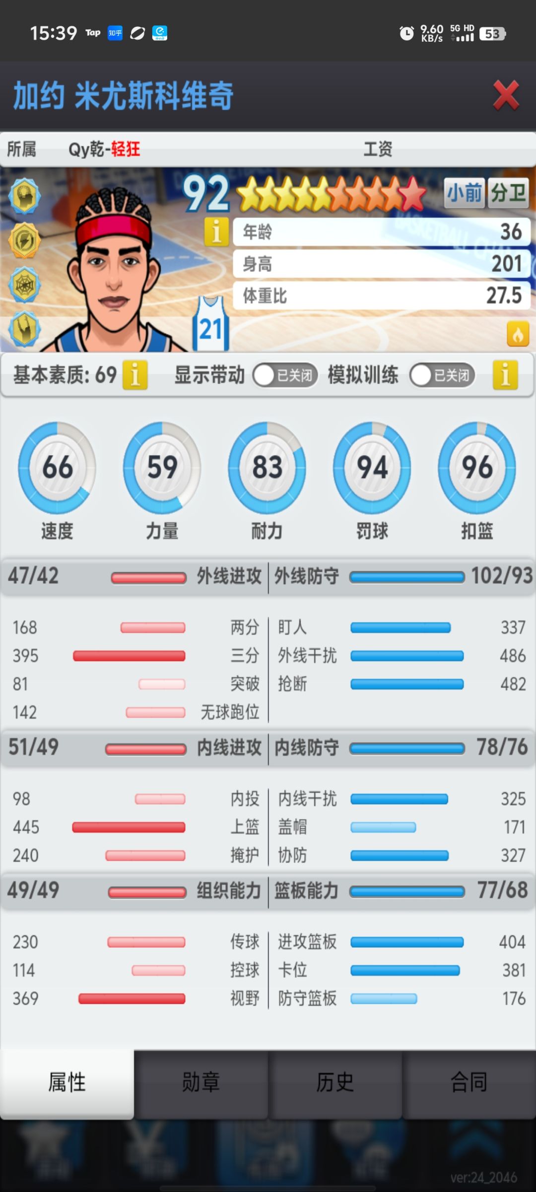本节课介绍一下常见的球员类型,不管是练苗还是建队,认识球员都是第一步。 👑基本素质 俗称身体,五项基本素质都有各自的作用 1.速度 速度的重要性并不局限于后卫,对于内线也是非常重要的。高速度的球员能更好的在跑位、挡拆中甩开防守球员,创造更好的投篮环境;同样的,高速的防守球员能更好的在挡拆、无球跑位中更快的追上进攻球员;高速的内线球员能更好的抢篮板。 2.力量 力量可以提升内线球员内投的强度;超过7