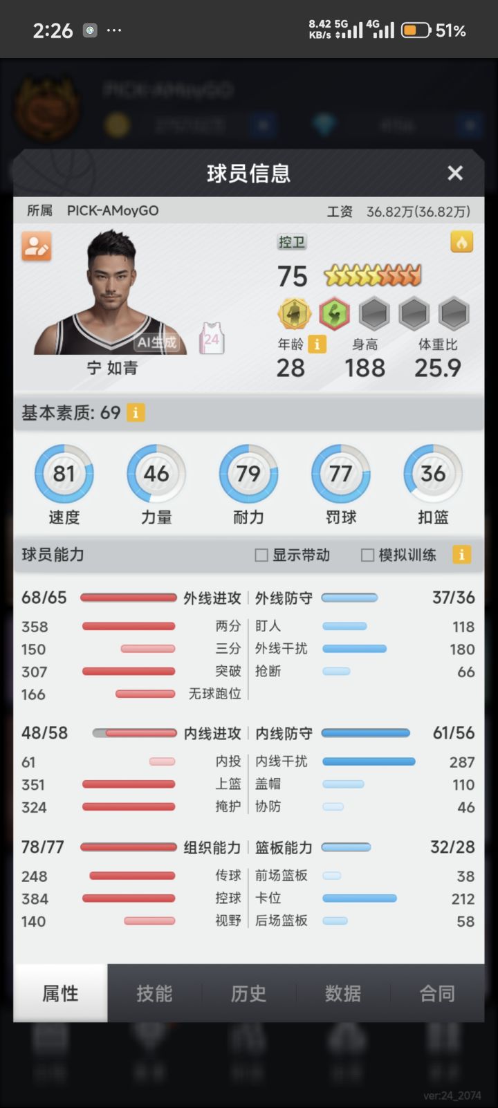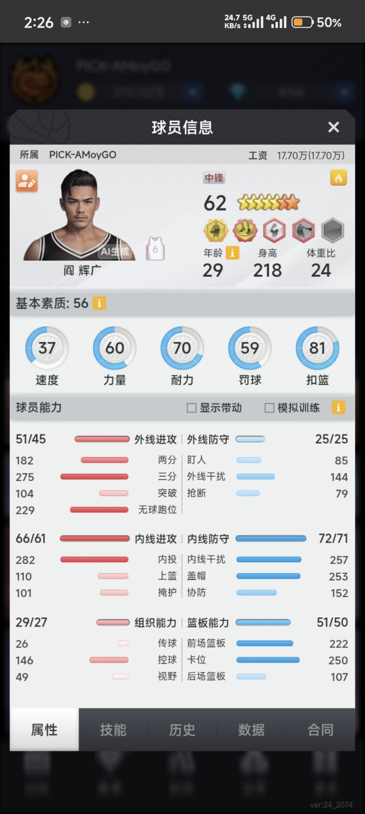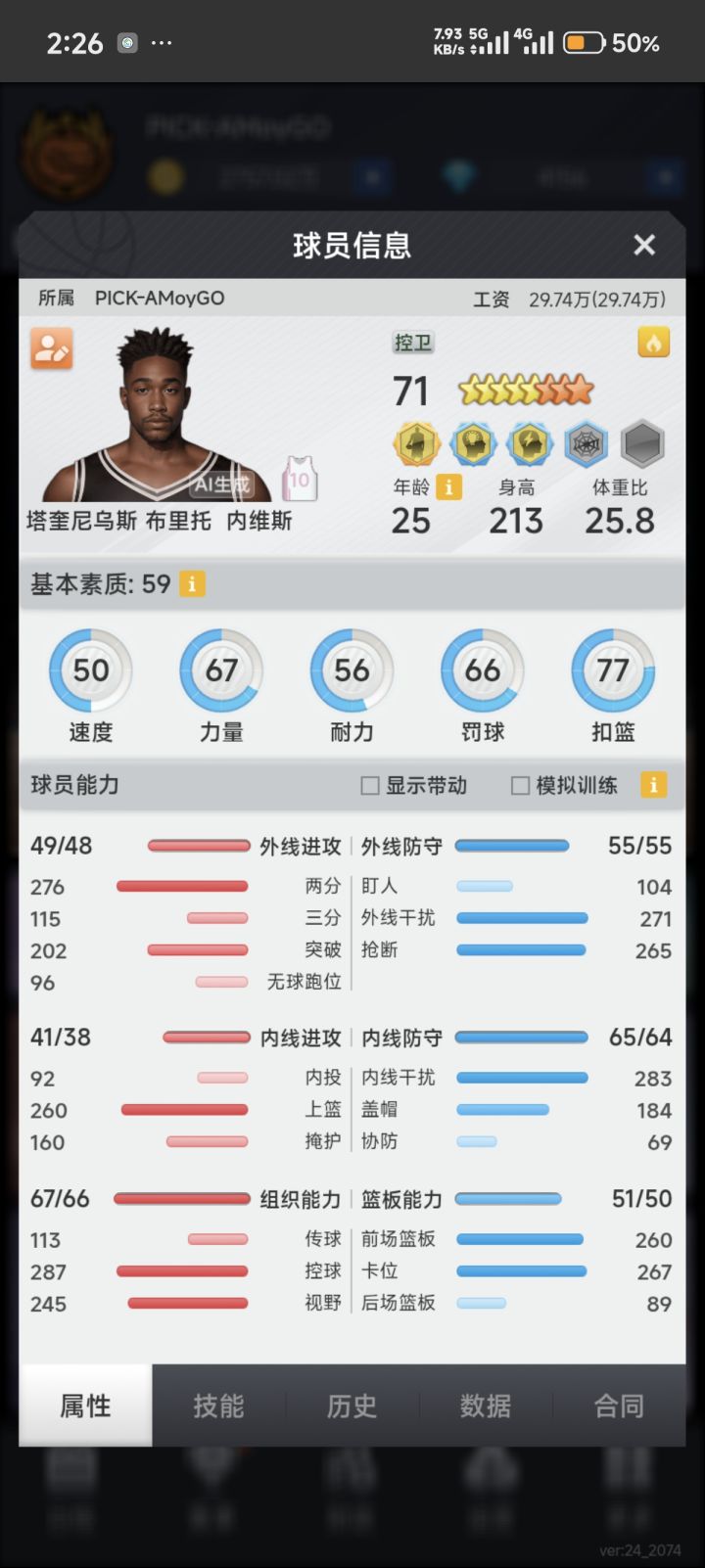 看你的阵容一个是很多球员比较水桶,工资高,无用属性练的多,另一个是整体基本都没有篮板。建议你可以保留得分效率高的外线大哥和内投,剩下的换成三防蓝领。建队思路这块可以去论坛多看看教学帖子