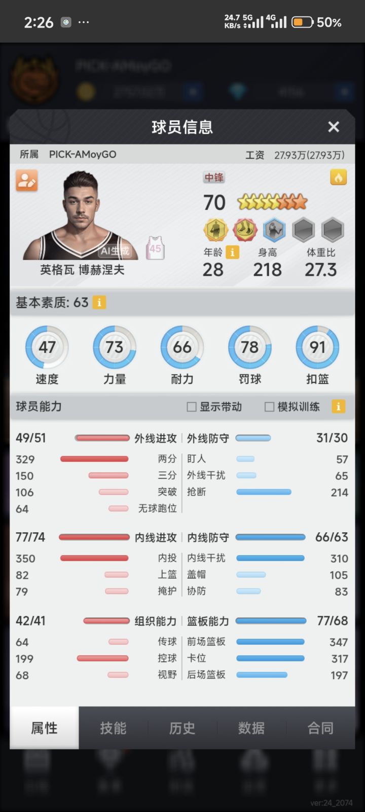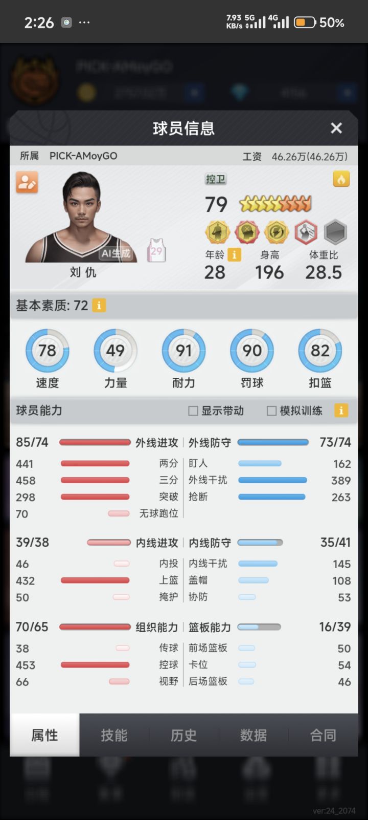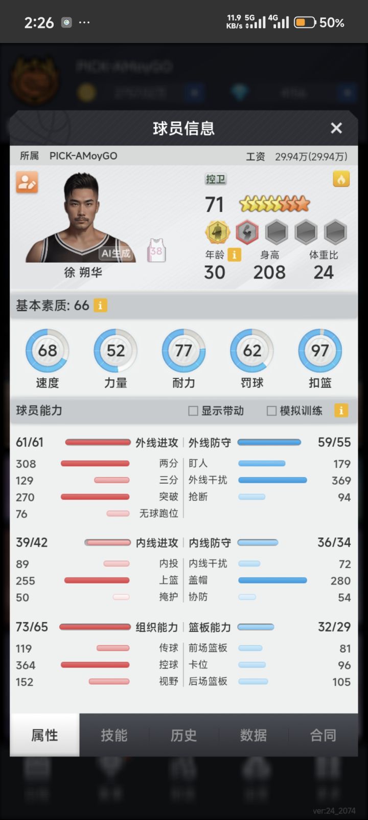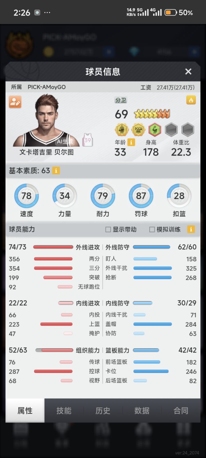 看你的阵容一个是很多球员比较水桶,工资高,无用属性练的多,另一个是整体基本都没有篮板。建议你可以保留得分效率高的外线大哥和内投,剩下的换成三防蓝领。建队思路这块可以去论坛多看看教学帖子