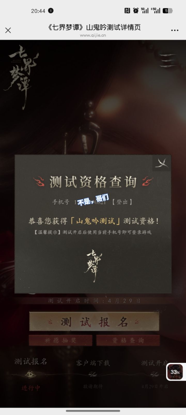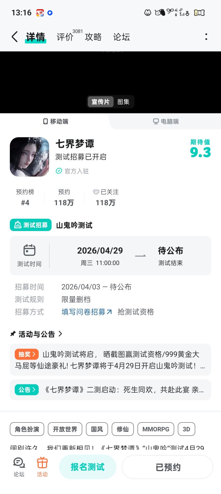 非常期待这个游戏的测试,原本只是在日常的刷Taptap找游戏,结果一眼就看中了这个游戏的封皮画风。因为我也玩燕云和逆水寒,所以对这个游戏有一种天然的亲切感。不知道为啥这么优秀的一款游戏热度却并不高,但是不能否认它的画风的优秀。非常希望能够得到这次的测试机会,爱你^3^