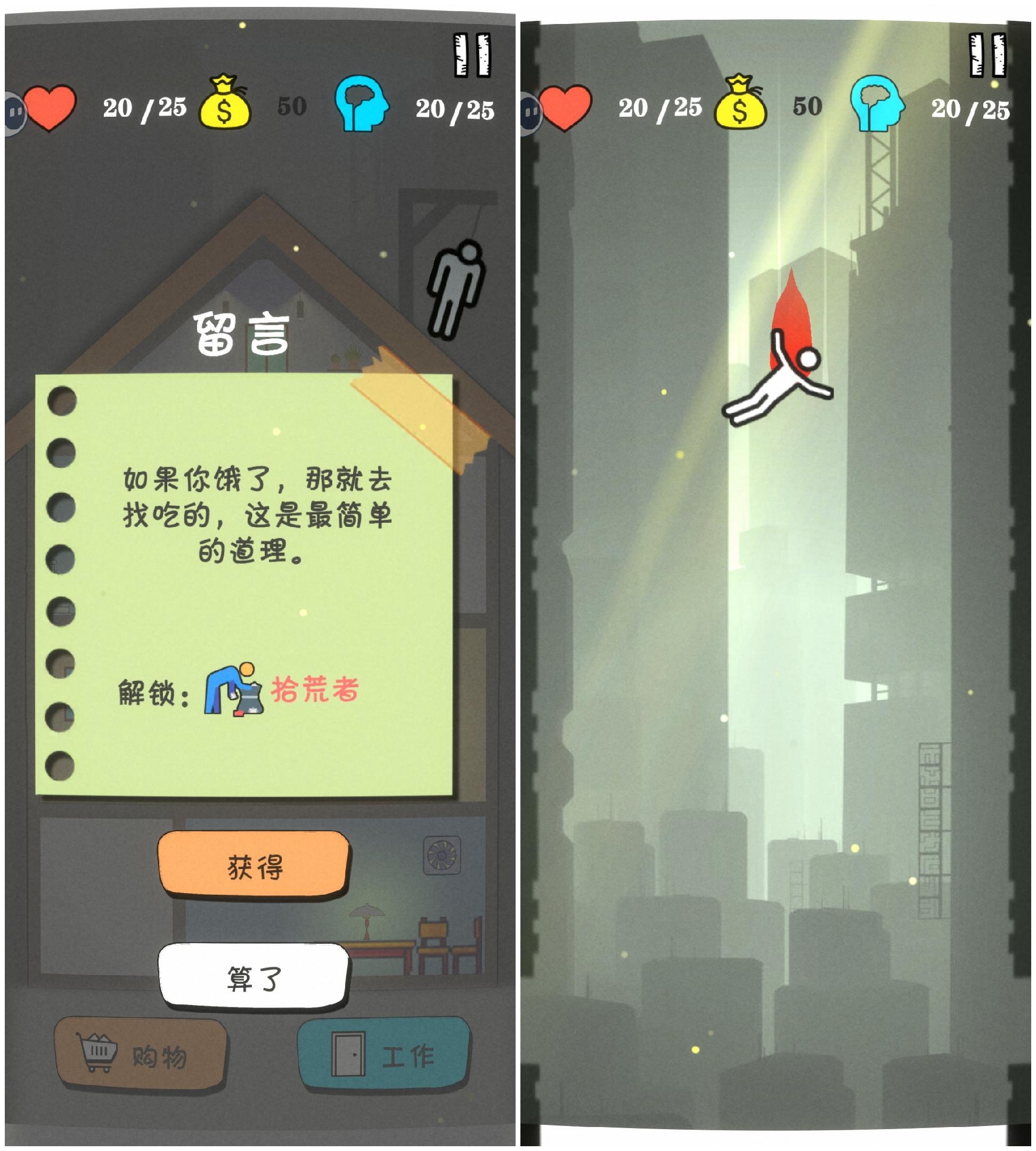 ①工作后获得的钱、吃喝后获得的体力精力,可以直接获得吗?为什么还非得捡一下?司机那个职业真的很讨厌,掉的金币排成两列,下落的时候注定最多只能捡到一半。活着已经这么难了,为什么还要让赚的钱被大风刮走,买的饭一口都没吃上?