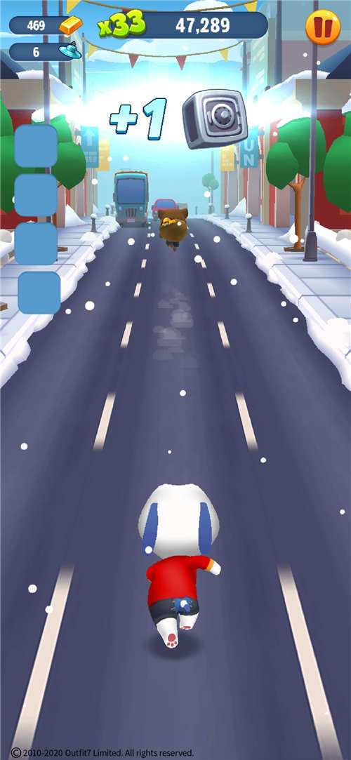进入游戏之后,看到汤姆猫站在庭院里,点击右下方的出发按钮进入游戏。游戏场景内依然是设计了三条线路供玩家游戏,操作方面玩家通过滑动屏幕来控制汤姆猫跳跃、滑动、躲闪,不论挡在面前的是什么障碍物,只要玩家操作得当便可以轻松的化险为夷。而游戏上方正中间是游戏得分数以及得分倍数,右上方的暂停按钮可以让你在必要的时候暂停游戏 在闯关之后会获得金砖,获得的金砖可以用来升级汤姆猫的房子,房子越是高级游戏分倍数越高