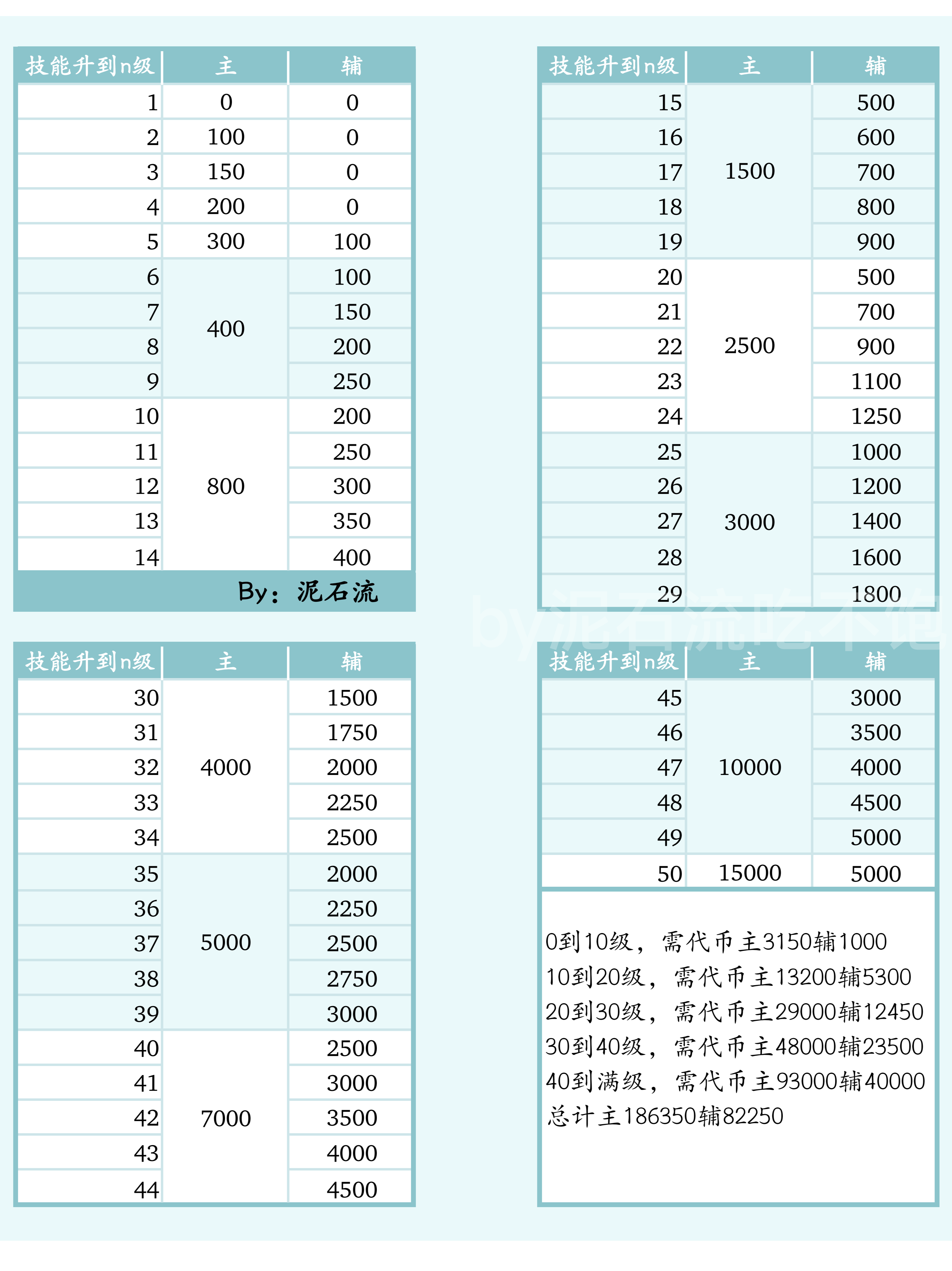 统计表来啦~升级技能和凡人精通所需代币