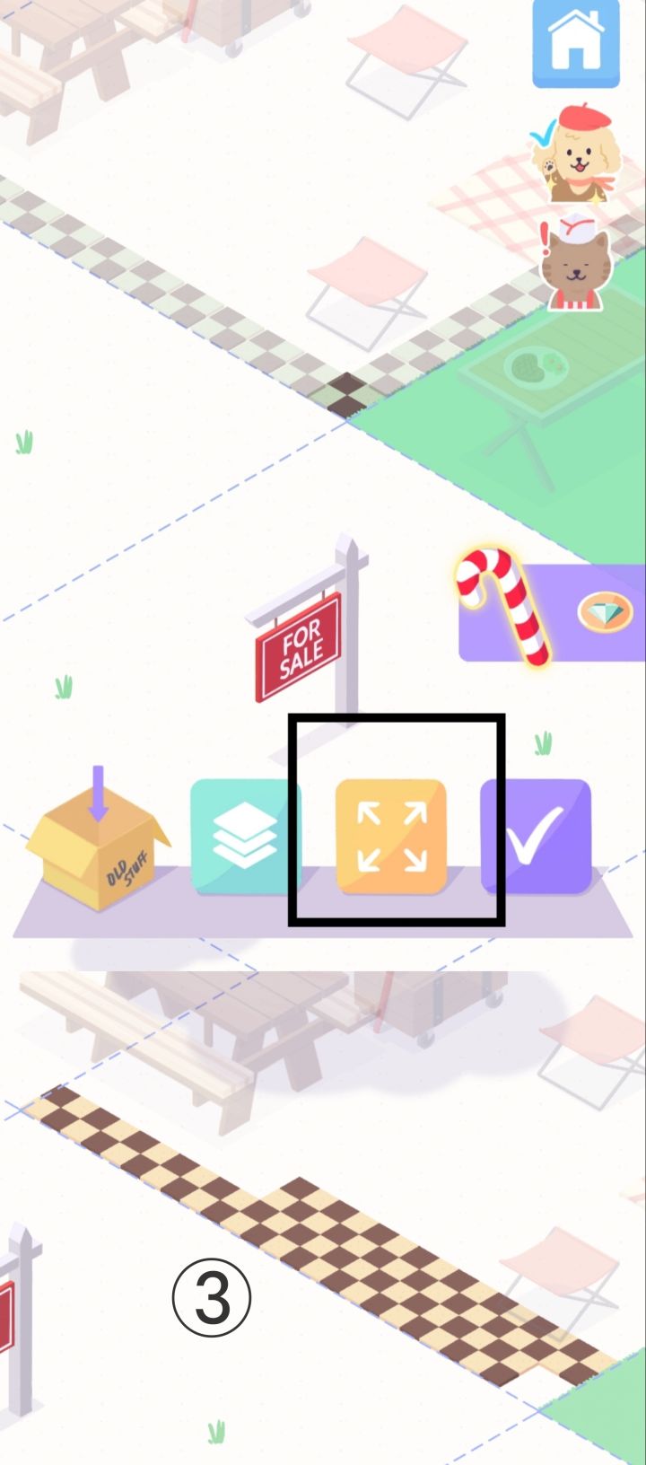1.如何快速收地板:如图1中①所示,点击后就能全部被选中(如图1中②所示),就可以一次性收起草坪了;[建议:进行“装修”时,右侧图标和非选中的建筑物可以隐藏或者透明度降低]2.如何快速铺地板:如图2所示,地板数量充足的情况下就可以铺满,不足就如③所示,一块地铺满好像是需要169块(也有可能记错了);3.如何快速装栅栏:如图3所示,选择所需要的位置,可以快速搞定;4.如何给动物改名:如图4,点