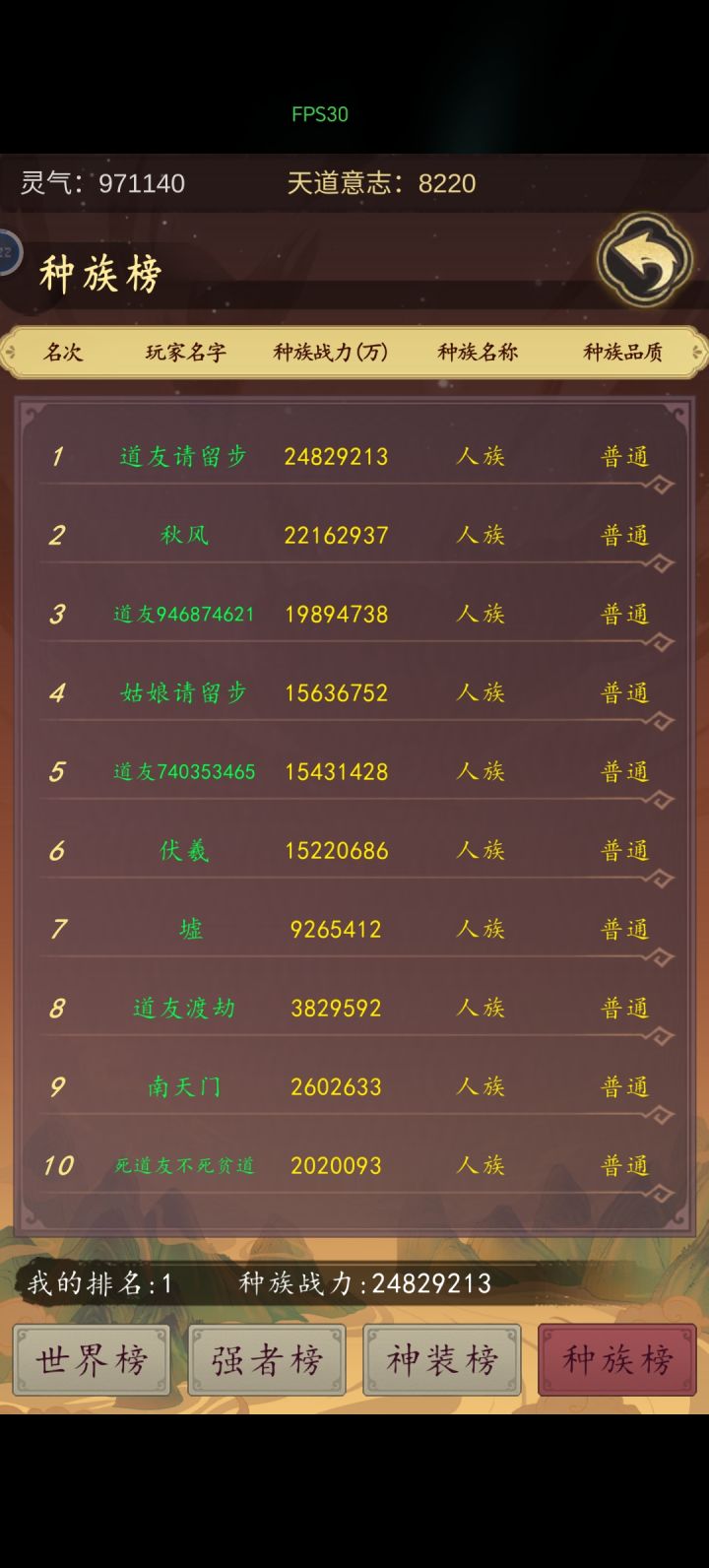 刚入坑的兄弟们先不要着急使用资源,花几分钟看一眼避坑攻略。1,关注游戏公众号天不可言,回复5701。2,天道意志在前期(小世界40以前)优先换灵气,别一次用完,每次用大概20%~30不够再补3,缔造性价比最高的是拿珍宝,每次缔造次数用完之后再升级世界4,菩提树能升就升,菩提树的等级决定强者的等级 ,5,强者尽量等级到了瓶颈再打造装备6,神话种子最好在等级提不动的时候时候用7,种族的主