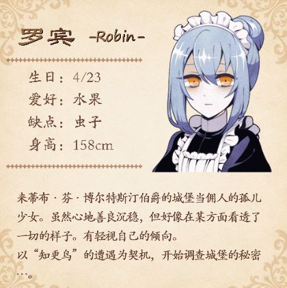 结局一 佛系女仆假装没有看到过【那个】,终日忙碌于大小事务,对其他事不闻不问。很普通的结局,没多大意义。结局二 幸福的安眠罗宾发现城堡每个人都知道知更鸟,但却都不愿意告诉她更多信息,一封神秘的信指引她翻看医务室的病历,结果发现自己接受过自己并不知道的手术。罗宾被放倒,女仆长一直说有问题就要修正,直到知更鸟孵化之日。难道罗宾是知更鸟的容器?结局三 再演果然杰克和OURU其实是双重人格