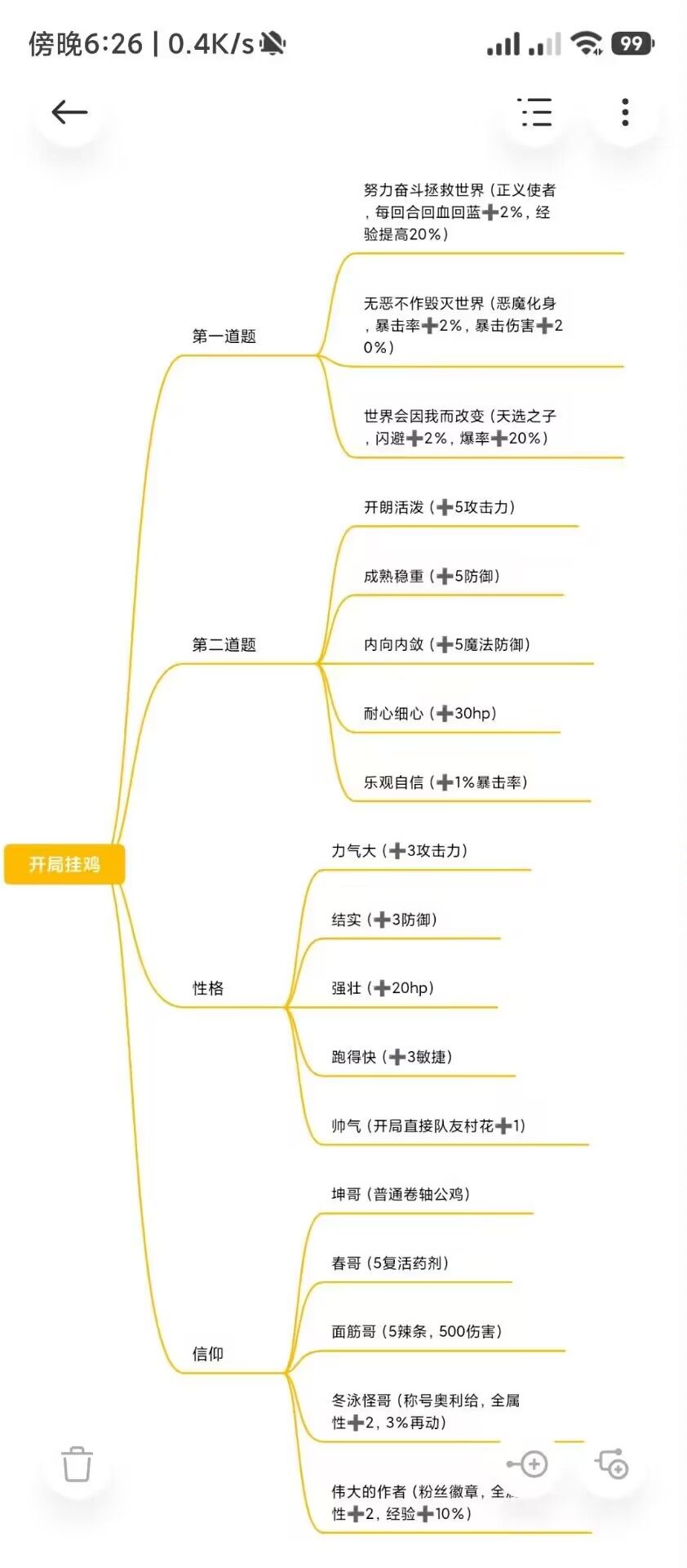 拯救世界:正义使者,每回合回血回蓝2%,经验+20% 毁灭世界:恶魔化身,暴击+2%,爆伤+20% 因你改变:天选之子,闪避2%,掉落+20% 信春哥:复活药剂。信作者:粉丝徽章。面筋哥:辣条(好像是一次性伤害500)打鸡王很爽! 冬泳怪:奥利给(称号) 乐观自信:+暴击被动,其他没有给被动(大力,结实,跑得快,帅,等等,都没有技能,有点记不清了) 不知道有没有记错,反正没几个。