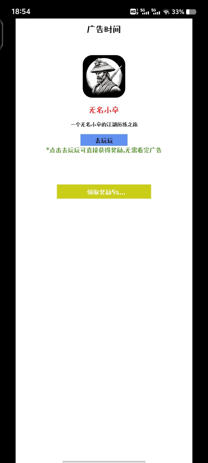 休闲挂机放置小游戏。广告一天30多个,看起来很多,其实几分钟就可以看完。一个广告10秒,并且点击去玩玩再返回可以直接获得奖励,特别良心。玩法也很简单。