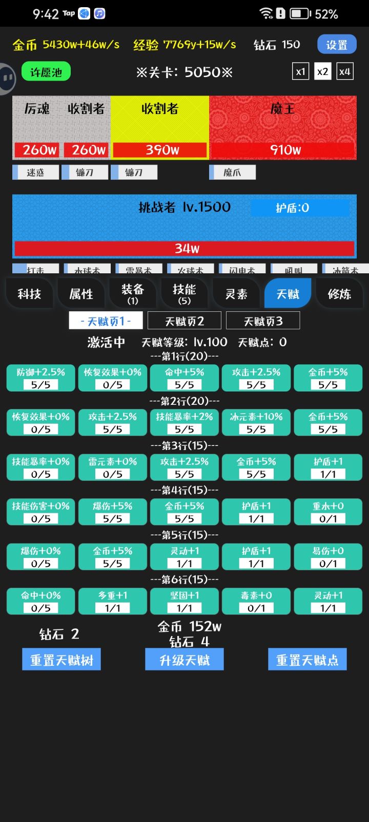 目前来看,元素属性(冰水火雷)只跟技能相关,各种技能的伤害倍率跟特殊效果里会吃到元素属性加成,所以前期升级给的属性点一定要把握好,不要乱加,钻石广告全看完能抽50次技能,但我个人建议不要抽完,抽个40来次就行,留点钻石洗点。毕竟一个技能不可能从头用到尾,总会遇到换技能的时候,如果换的技能跟之前自己用的技能吃到的元素属性不一样,这时候就需要洗点来换自己的主力元素属性。(个人推荐技能里选择御剑术这个