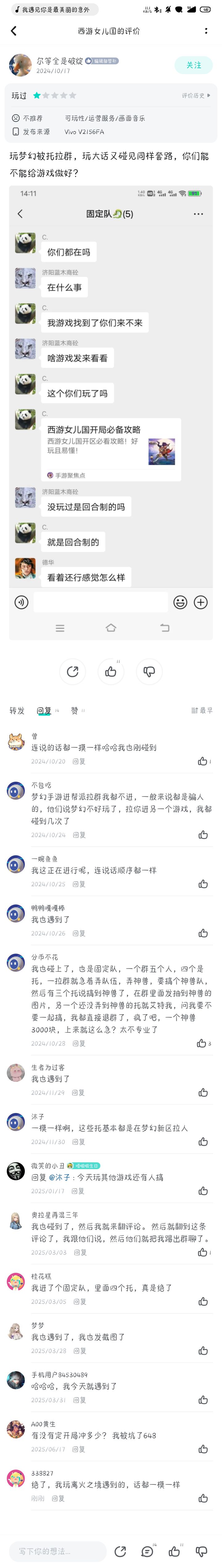 被离火固定队推荐,然后过来看评论区就看到了图二。也太离谱了吧,这游戏就靠到处拉人吗。把游戏做好比什么拉人都有效果,别太离谱。话术都一模一样,要给我笑死了