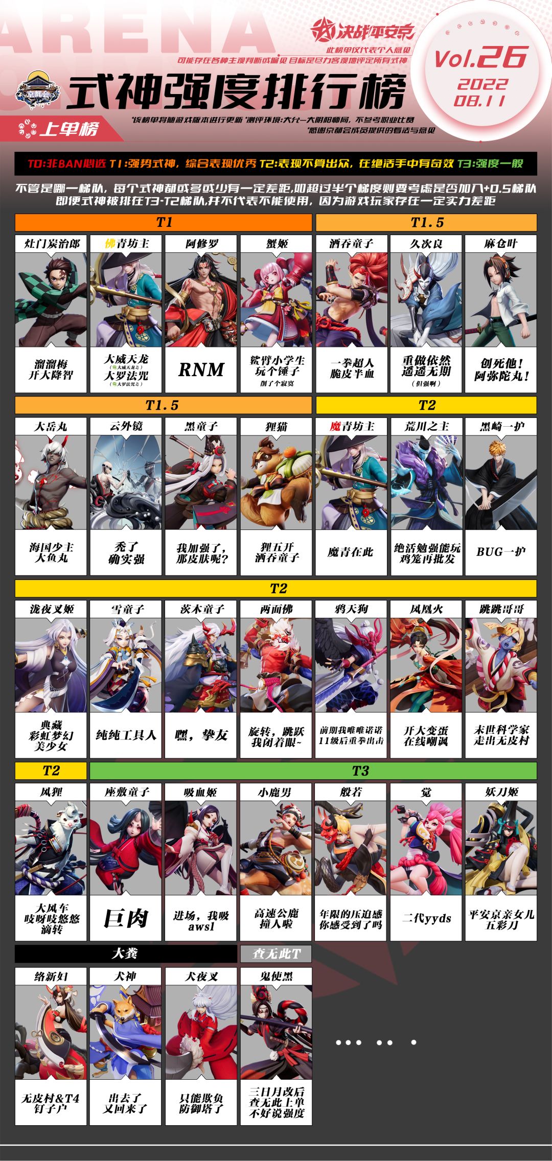 鸣谢 所罗门poi-(上单) 整蛊高手然(打野) 平安京播磨法师(中单) 如鹿思慕溪m(射手) 粽子馅青蛙_吧唧(辅助) 这次更新有幸邀请到以上玩家协助本期排行榜的制作 《京都会》 致力于给广大玩家提供攻略,帮助大家能够有更好的游戏体验 前言: 仅代表个人观点 不等于绝对客观 可能存在各种主观评判甚至偏见 目标是客观评定所有式神 将会随着版本进行更新 【测评环境:大允-名士局 不参考职业比赛】 不